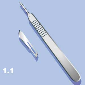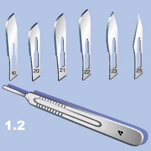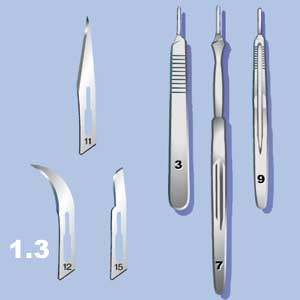 The most commonly used blade sizes are #10, #20, and #22 (Figure 1.2). Figure 1.3 demonstrates other designs of scalpel blades which include a bayonet tip blade #11(a), a bistoury blade #12(b), and a small blade #15(c). Handle #4 fits into larger blades (#’s 20, 21, 22, 25) (Figure 1.2) and handles #3, 7, and 9 fit into smaller blades (#’s 10, 11, 12, 15) (Figure 1.3).